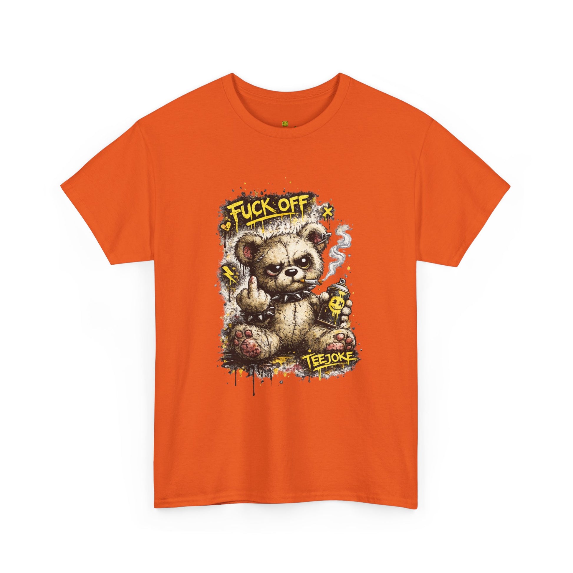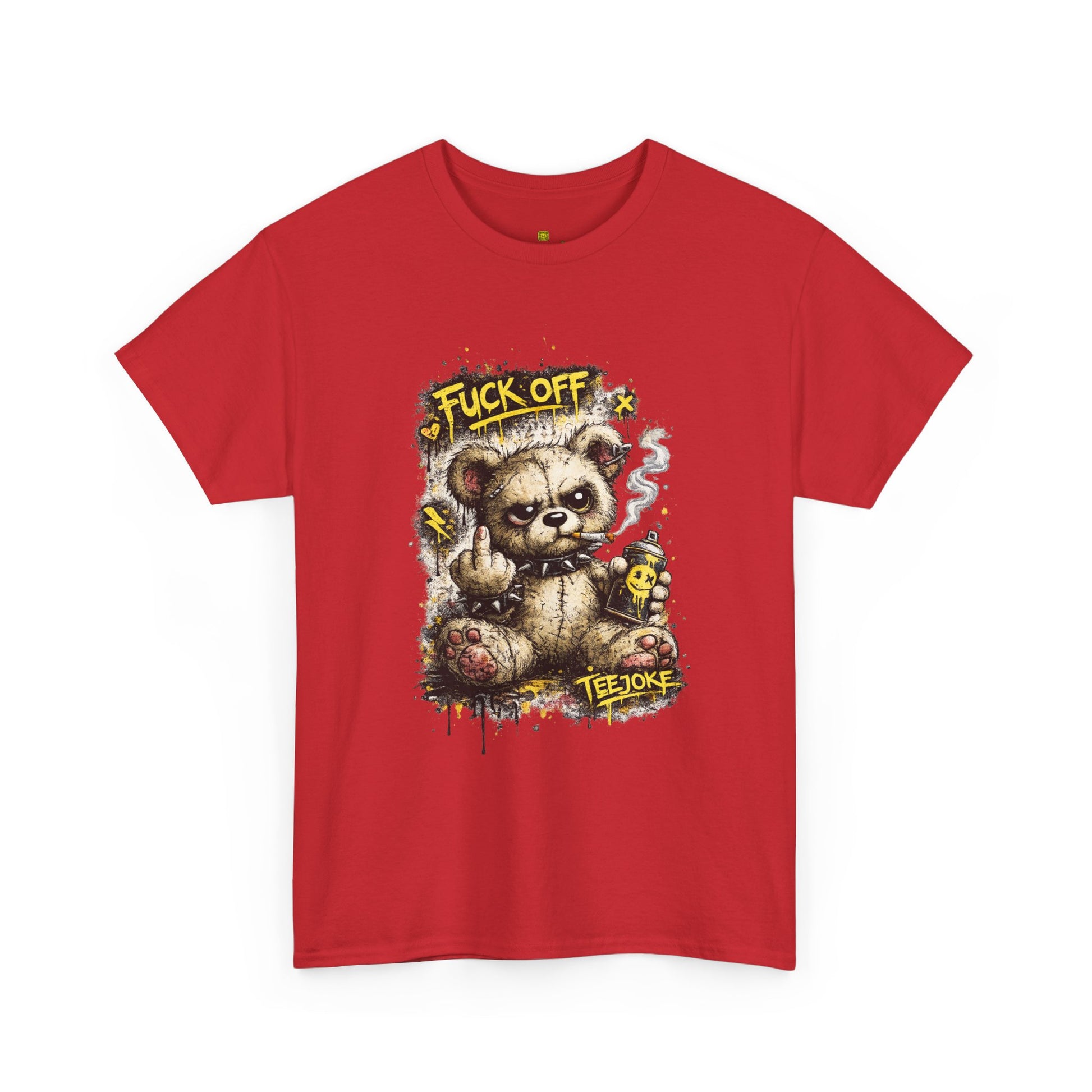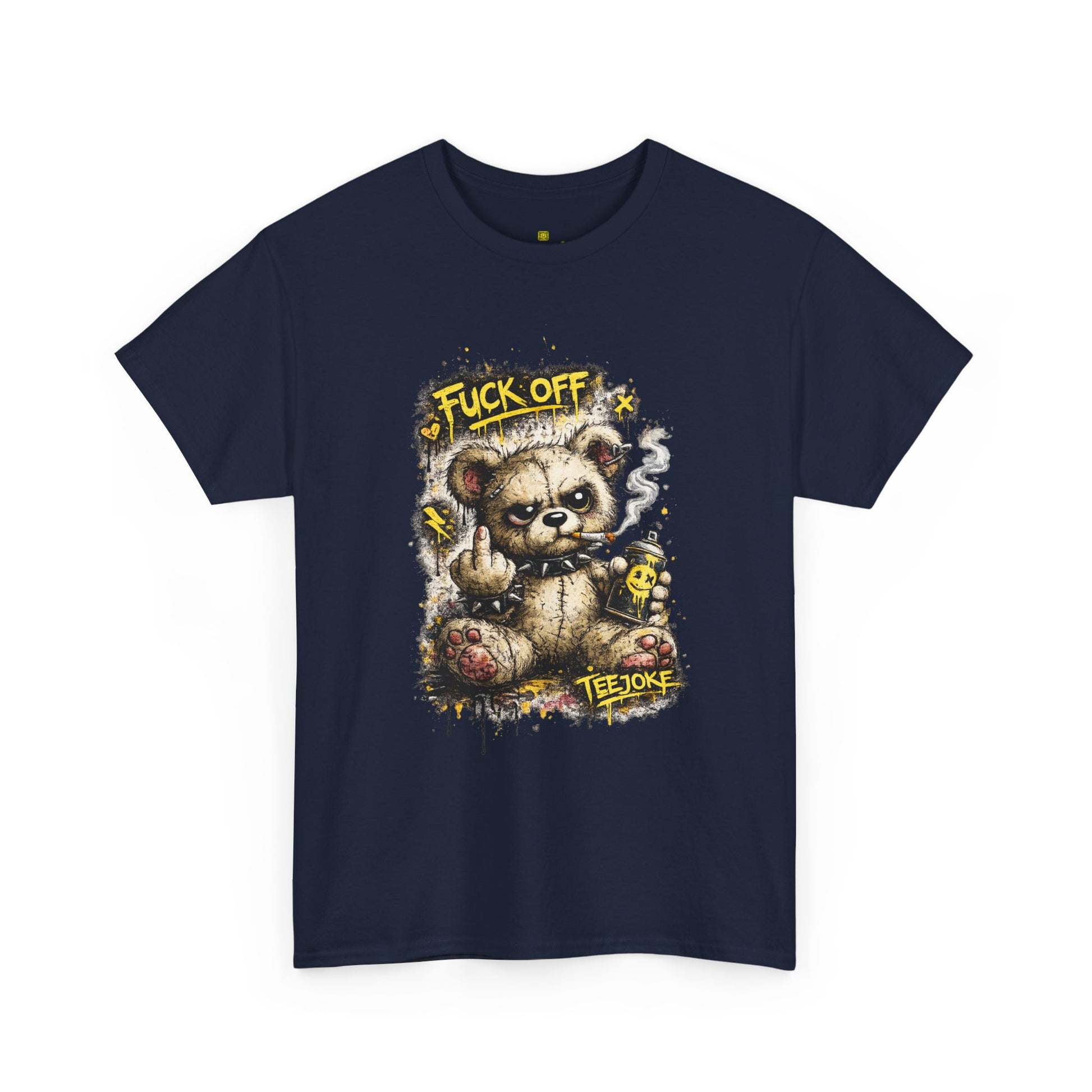 La Camiseta TeeJoke “Fuck Off Teddy” rompe con cualquier idea de ternura. Un oso de peluche desgastado, con mirada desafiante, fumando y levantando el dedo en un claro mensaje de actitud callejera.