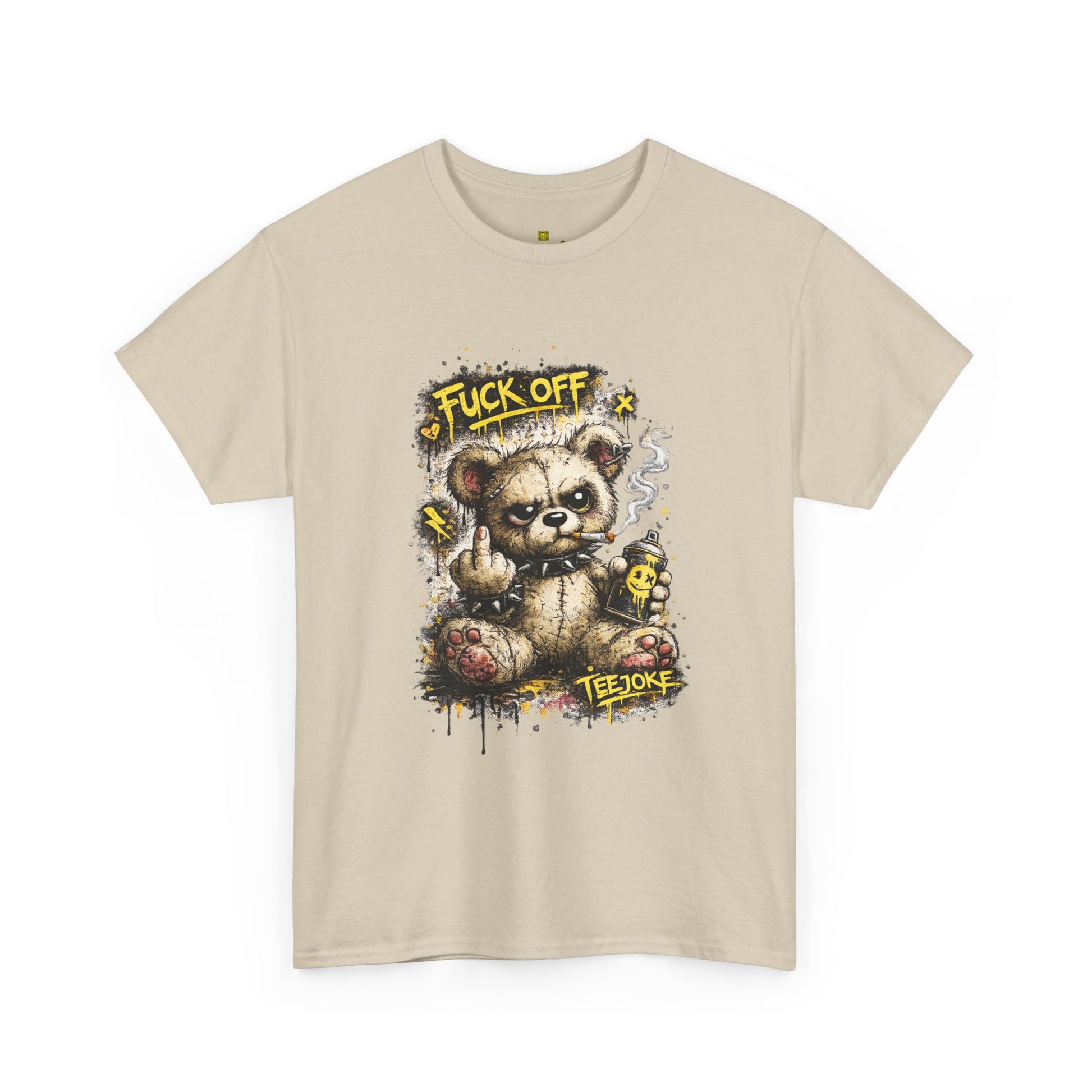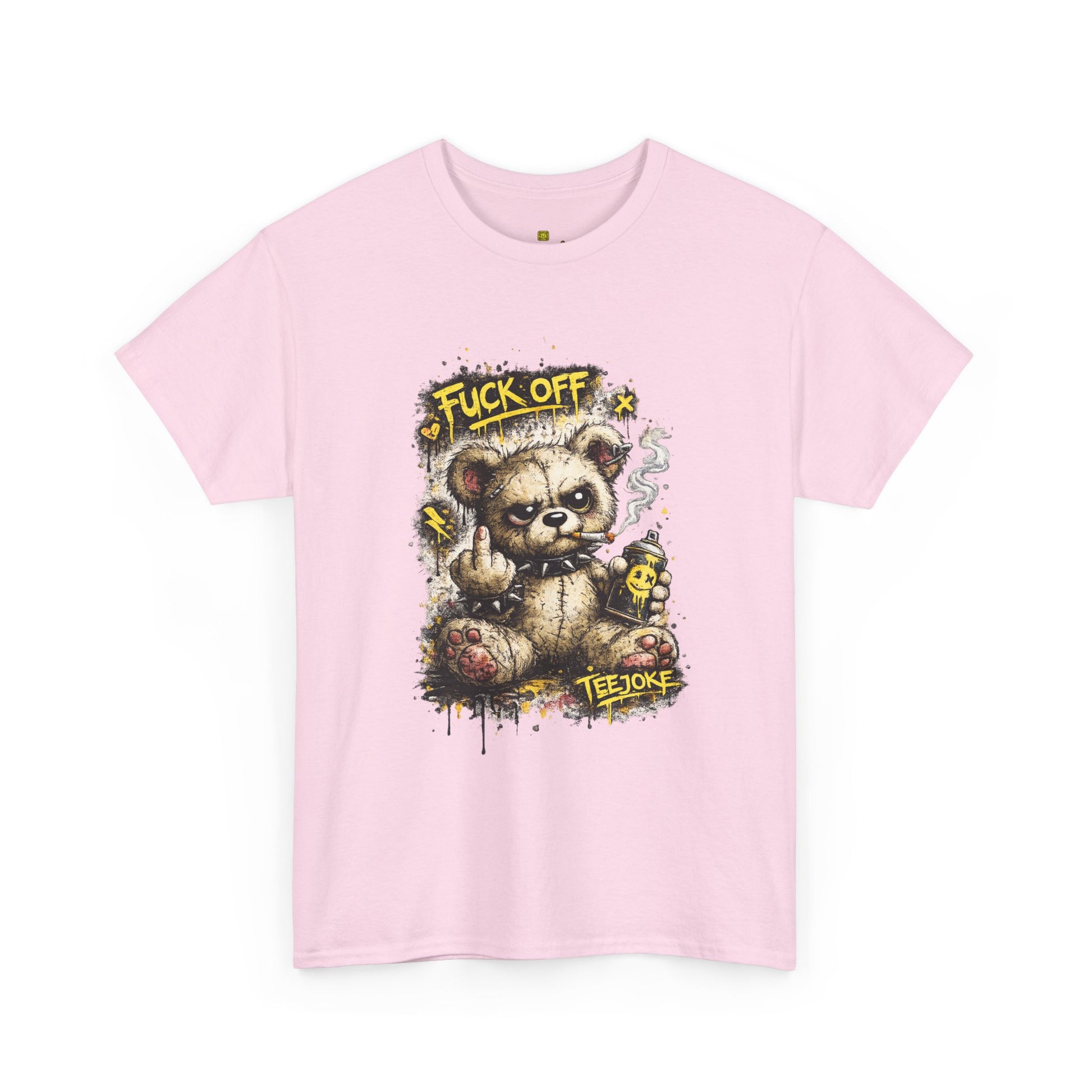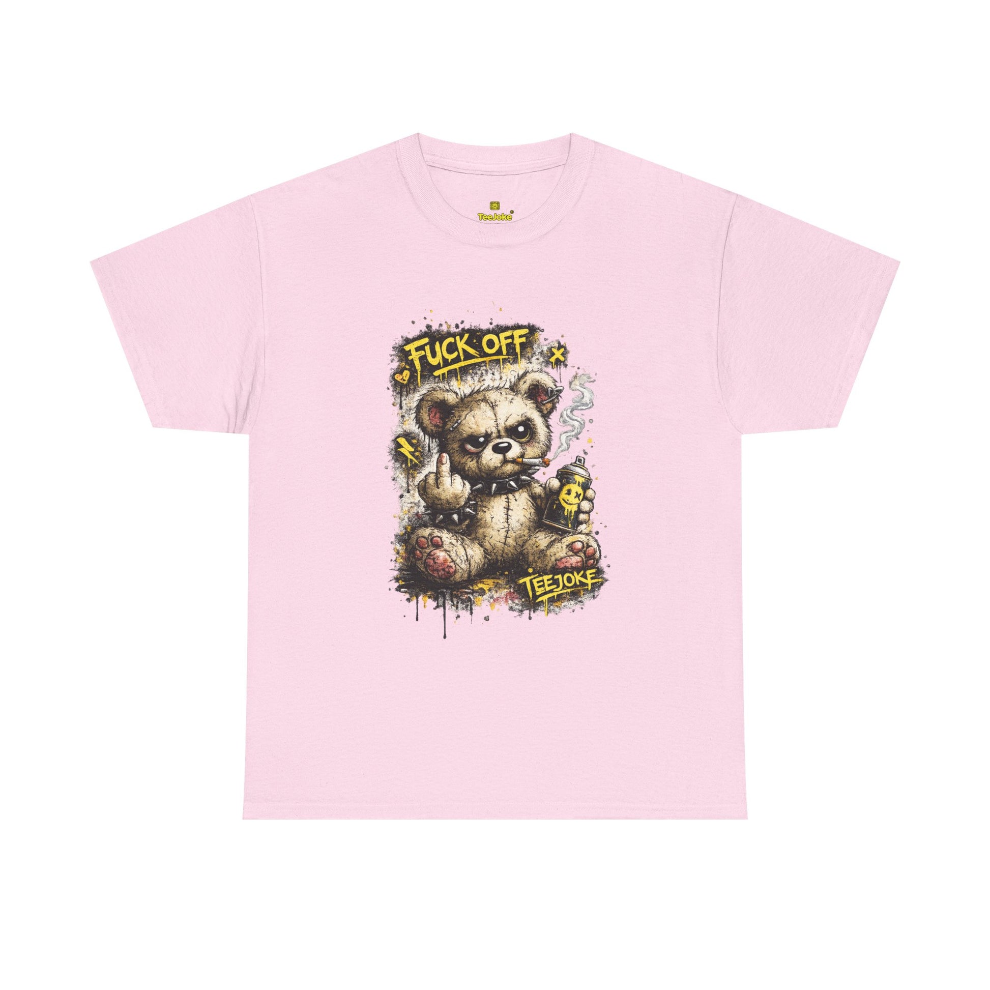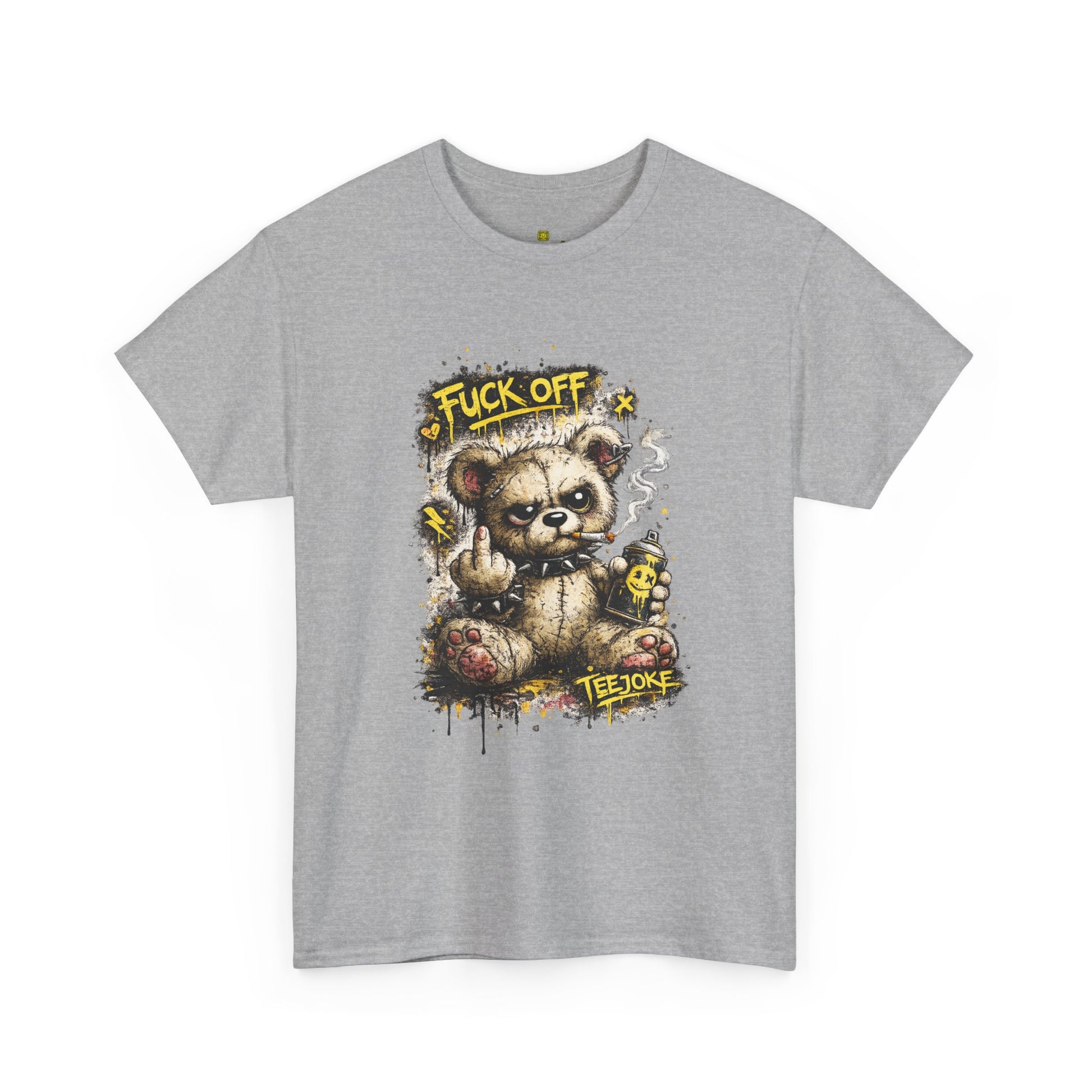 La Camiseta TeeJoke “Fuck Off Teddy” rompe con cualquier idea de ternura. Un oso de peluche desgastado, con mirada desafiante, fumando y levantando el dedo en un claro mensaje de actitud callejera.